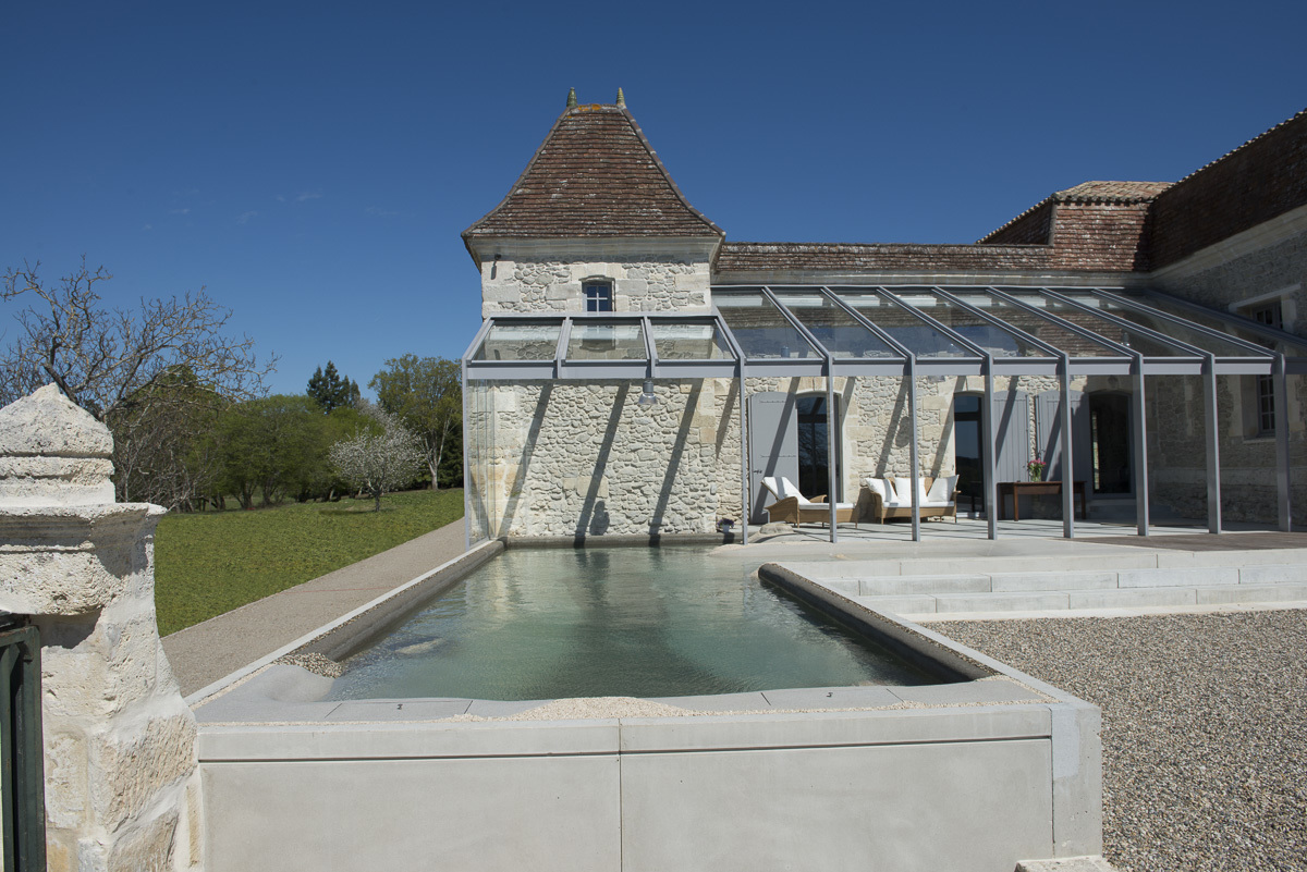 L'idée principale de la rénovation a été de conserver au maximum l'âme de la bâtisse, conserver son aspect ancien, rural et classique. Les éléments contemporains ne sont, dès lors, que très peu visibles de l'extérieur, si ce n'est quelques touches, telle que le béton brut utilisé pour le portail ou le muret de la grande terrasse en façade Sud. Les parties en béton brut sont également recouvertes de pierre taillées de Bordeaux afin de marier ancien et contemporain.